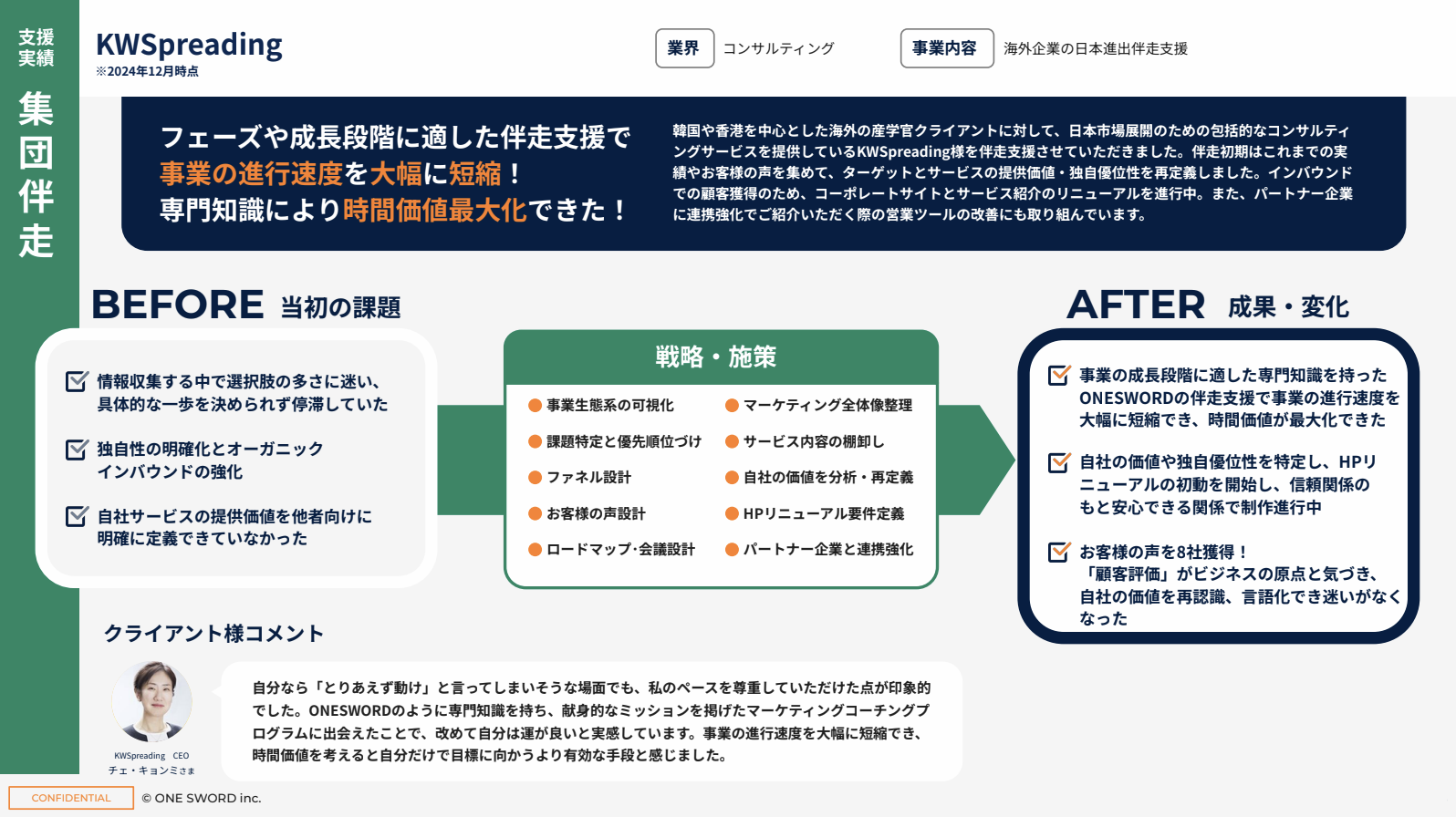 ワンソードが、実際のクライアント支援の現場で何百回と使ってきた思考整理のフレームとワークシートをベースにしているので、学ぶだけでなく、手を動かしながら、自分の事業を前に進めることができます。